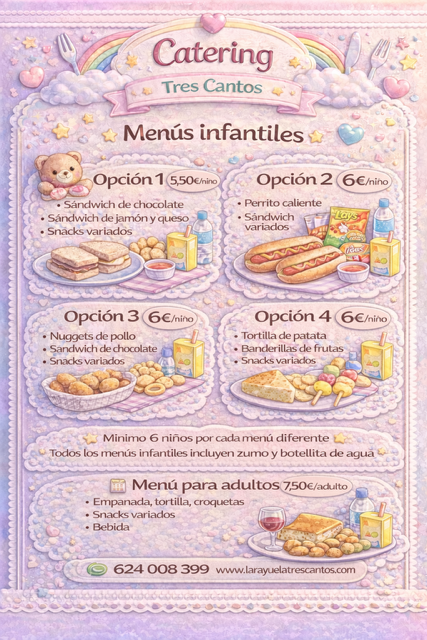 Para los niños, ofrecemos 4 deliciosas opciones de menú infantil. Si decides combinar dos tipos de menú, solo necesitamos un mínimo de 6 niños por cada tipo. Recuerda que el menú seleccionado será el mismo para todos los niños, así que puedes escoger el que más les guste a todos.