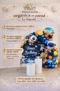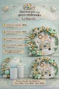 ademas para las decoraciones orgánicas en arco redondo podrás alquilar por 20€ más la lona temática.