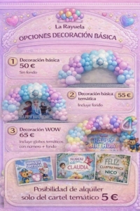 ¡Tenemos decoraciones de todo tipo! Desde princesas hasta superhéroes, pasando por fiestas tropicales, y mucho más. Podrás ver la lista de temáticas de las que disponemos en el formulario de reserva. ¿No encuentras la temática que quieres? No hay problema, dinos en los comentarios de la reserva, y haremos magia para conseguirla. ✨