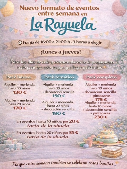 Hemos creado 3 packs especiales para reservas realizadas de lunes a jueves, pensados para que no tengas que preocuparte de nada: merienda, decoración y extras, según el pack elegido.